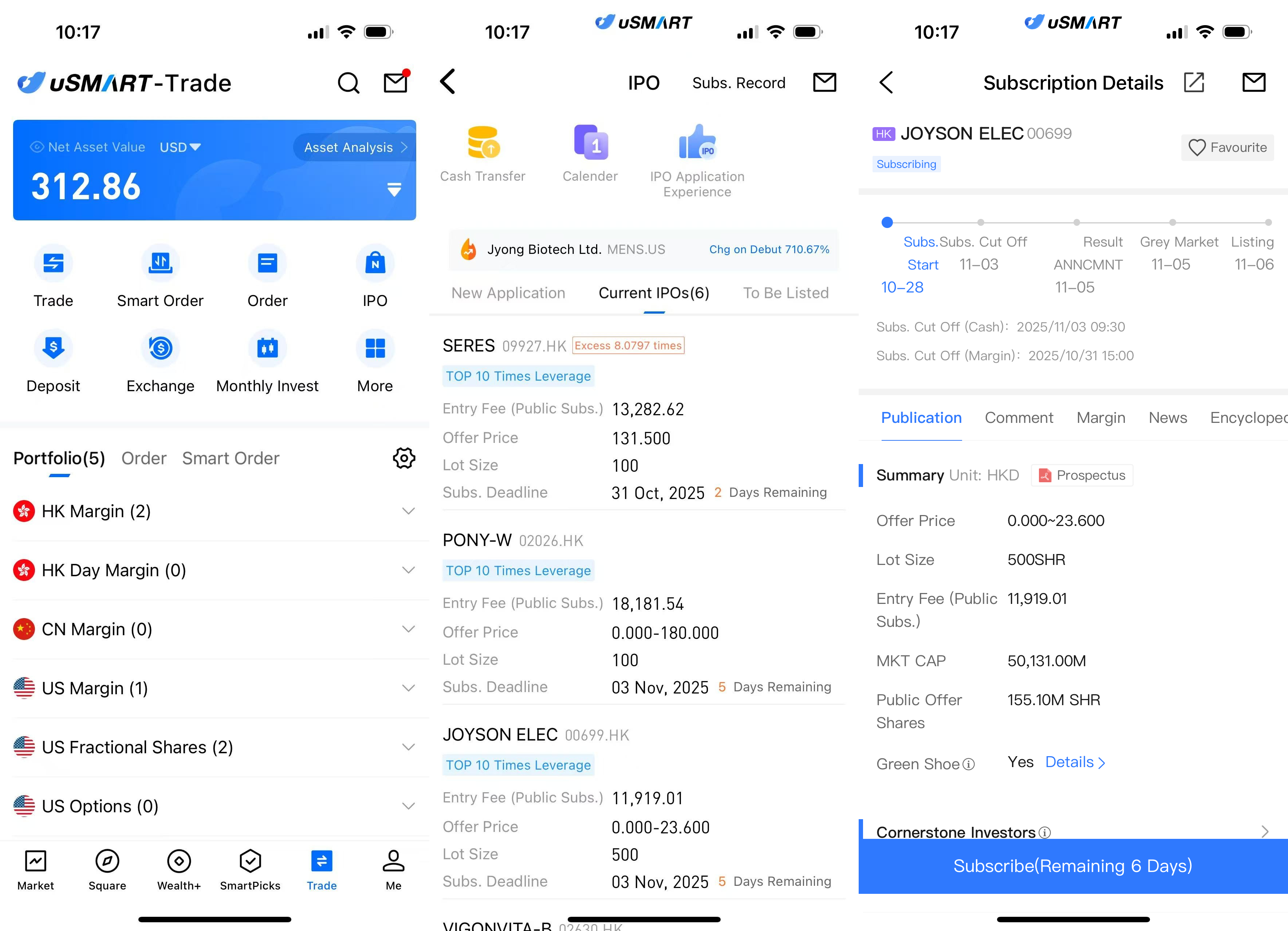 The uSMART HK App features an IPO Centre with exclusive perks, allowing clients to subscribe instantly to public offerings. After logging into the app, tap "Trade" at the bottom-right, go to "IPO Subscription," select Joyson Electronics, tap "Public Offer," enter your subscription quantity, and submit your order.
