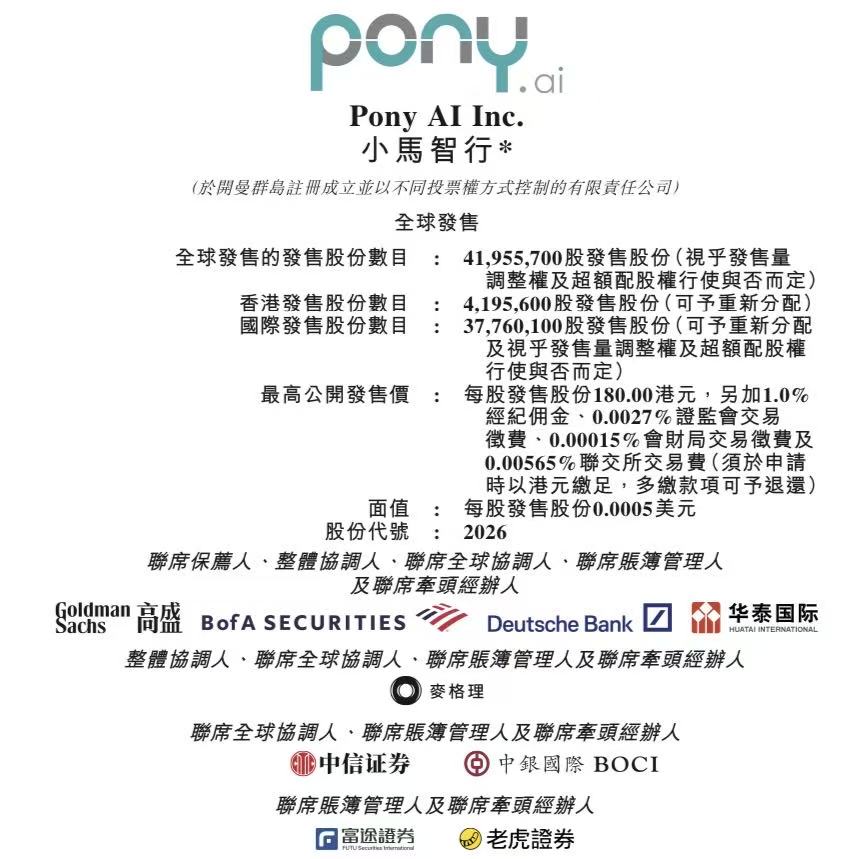 Pony AI Inc. (02026.HK) has launched its Hong Kong IPO. The subscription period is from October 28 to November 3, with a global offering of 41,955,700 shares and a 15% over-allotment option. The maximum offer price is HK$180.00 per share, with a minimum purchase of 100 shares and an entry fee of approximately HK$18,181.54. The shares are expected to be listed on the Hong Kong Stock Exchange on November 6. The joint sponsors are Goldman Sachs (Asia), Huatai Financial, Deutsche Securities, and Merrill Lynch Asia-Pacific.