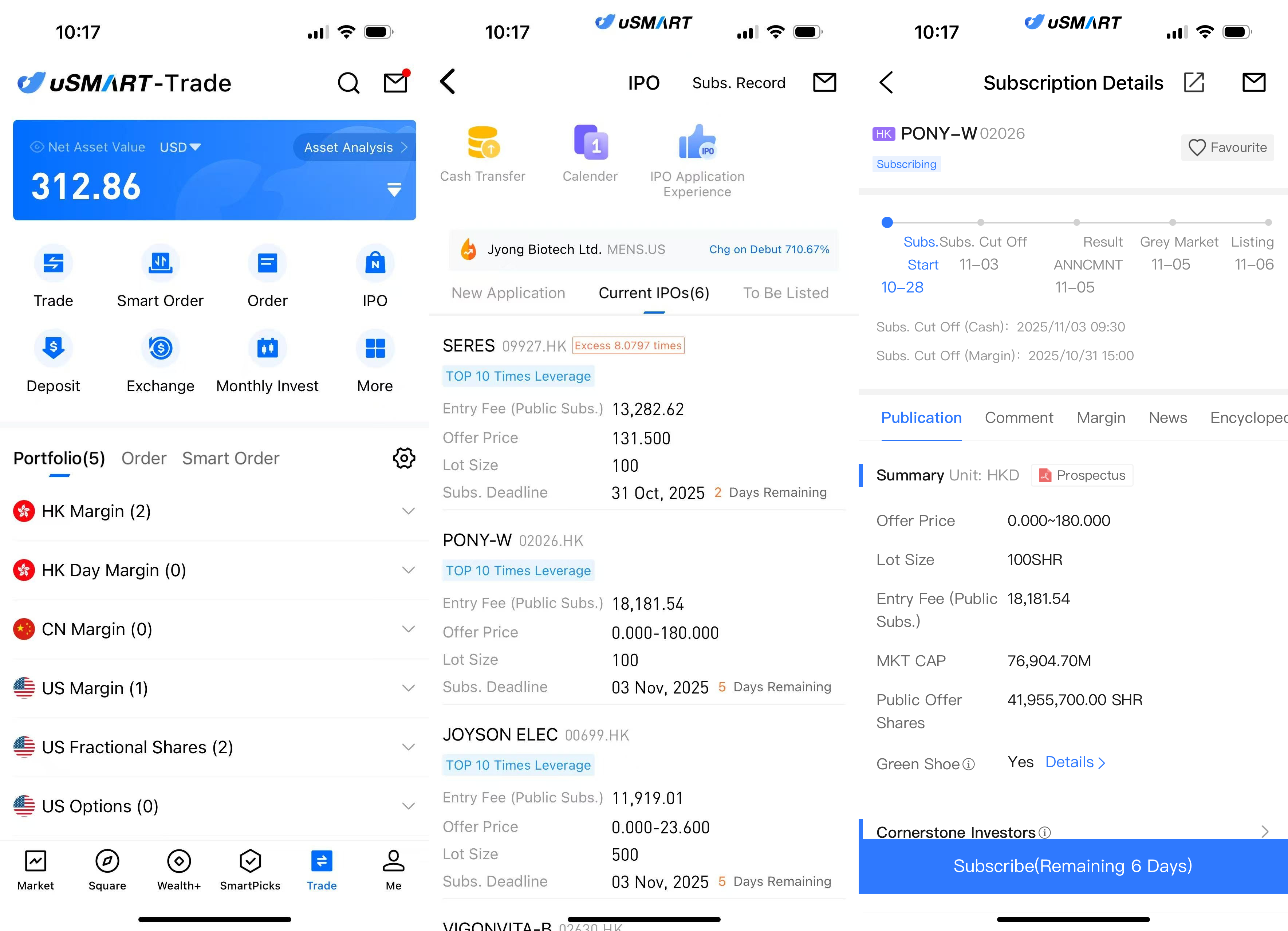 The uSMART HK App features an IPO Centre with exclusive perks, allowing clients to subscribe instantly to public offerings. After logging into the app, tap "Trade" at the bottom-right, go to "IPO Subscription," select Pony AI, tap "Public Offer," enter your subscription quantity, and submit your order.