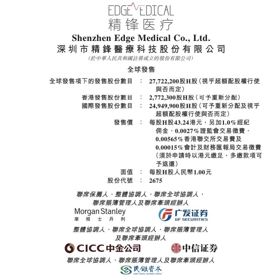 Shenzhen Edge Medical Co., Ltd. (2675.HK) has launched its Hong Kong initial public offering, with the subscription period running from December 30, 2025 to January 5, 2026. The company plans a global offering of 27,722,200 H shares, with a 15% over-allotment option. The offer price is set at HK$43.24 per share, with board lots of 100 shares each and an entry fee of approximately HK$4,367.61. Trading is expected to commence on the Main Board of the Hong Kong Stock Exchange on January 8, 2026. The joint sponsors are Morgan Stanley and GF Securities.