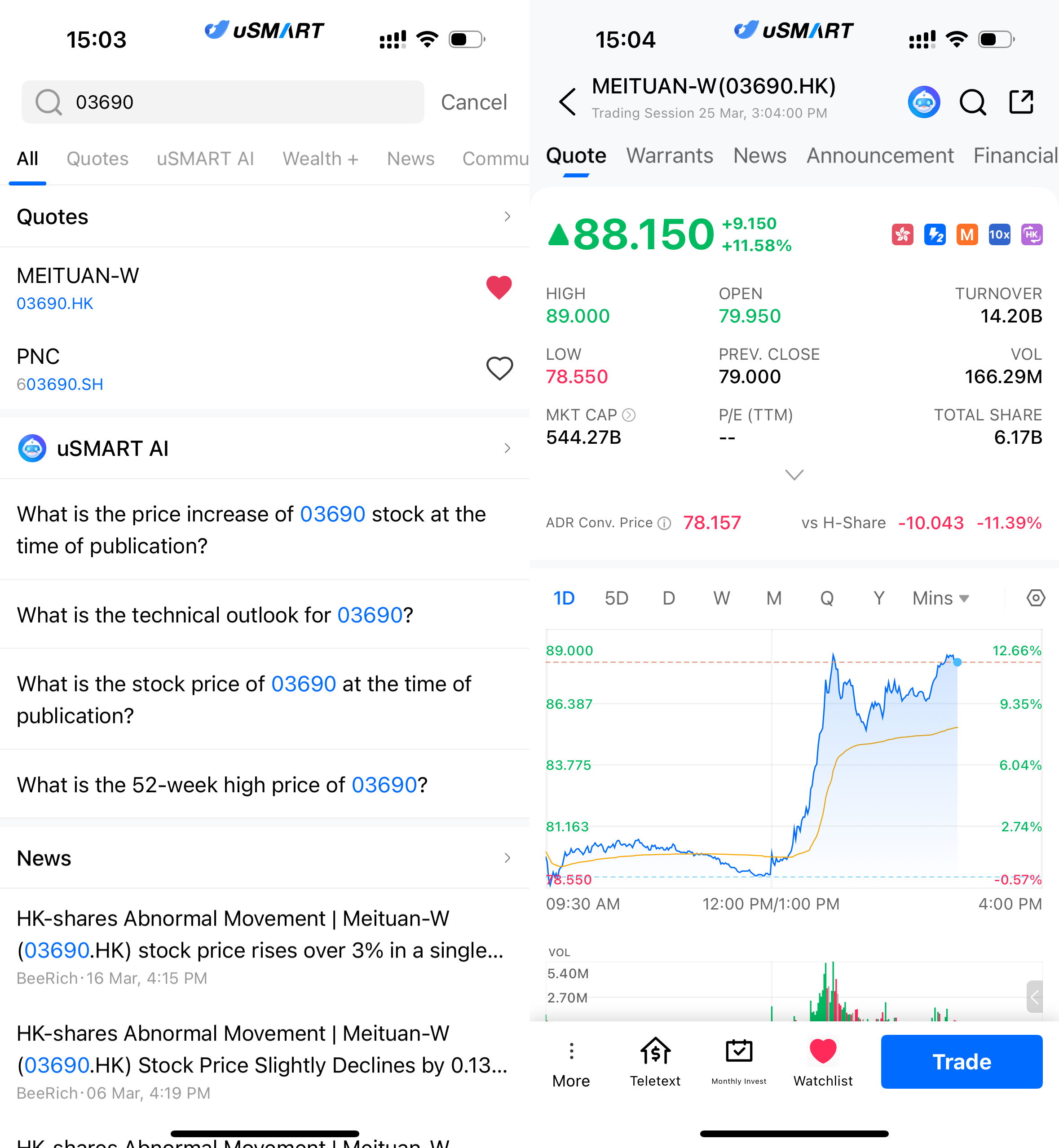 After logging into the uSMART HK app, click the “Search” button in the top-right corner of the page, enter the ticker code(03690.HK), and navigate to the details page to view transaction details and historical trends. Click the “Trade” button in the bottom-right corner, select the trade type, and submit your order after filling in the transaction conditions.