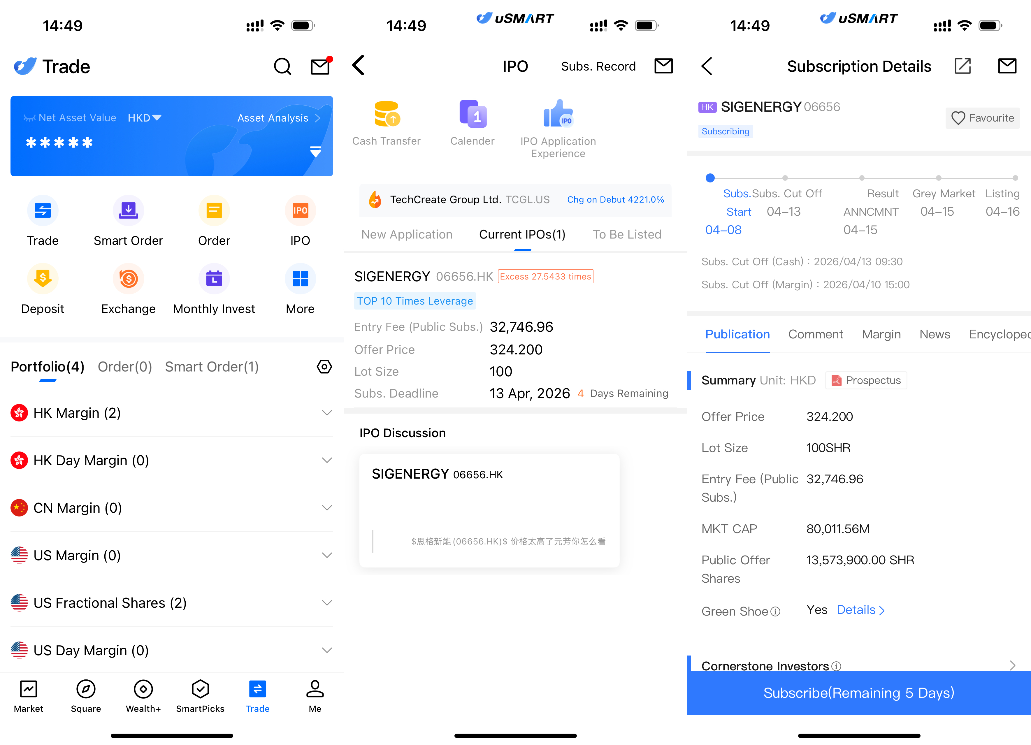 The uSMART HK App features an IPO Centre with exclusive perks, allowing clients to subscribe instantly to public offerings. After logging into the app, tap "Trade" at the bottom-right, go to "IPO Subscription," select Sigenergy Technology, tap "Public Offer," enter your subscription quantity, and submit your order.