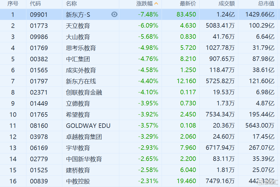 格隆汇5月24日丨教育股再度重挫,新东方跌7.48%,天立教育跌逾6%,大山教育跌5.68%。上周五召开的中央全面深化改革委员会第十九次会议强调,义务教育最突出的问题之一是中小学生负担太重,短视化、功利化问题没有根本解决。要全面规范管理校外培训机构,坚持从严治理,对存在不符合资质、管理混乱、借机敛财、虚假宣传、与学校勾连牟利等问题的机构,要严肃查处。要明确培训机构收费标准,加强预收费监管,严禁随意资本化运作,不能让良心的行业变成逐利的产业。要完善相关法律,依法管理校外培训机构。