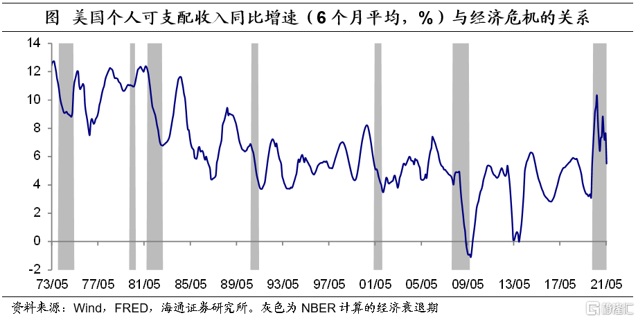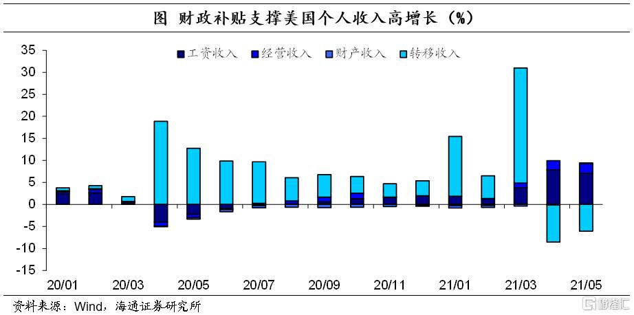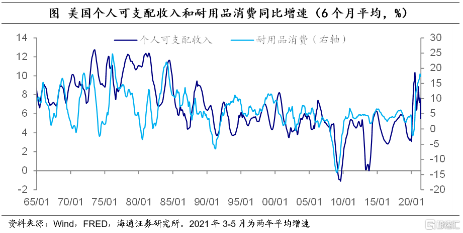 居民收入是影響耐用品消費的最主要因素之一。前期美國耐用品消費大繁榮的一個重要原因,就是政府大量轉移支付帶來居民收入的提高。根據歷史數據,個人可支配收入增速一般領先耐用品消費增速約4-6個月。