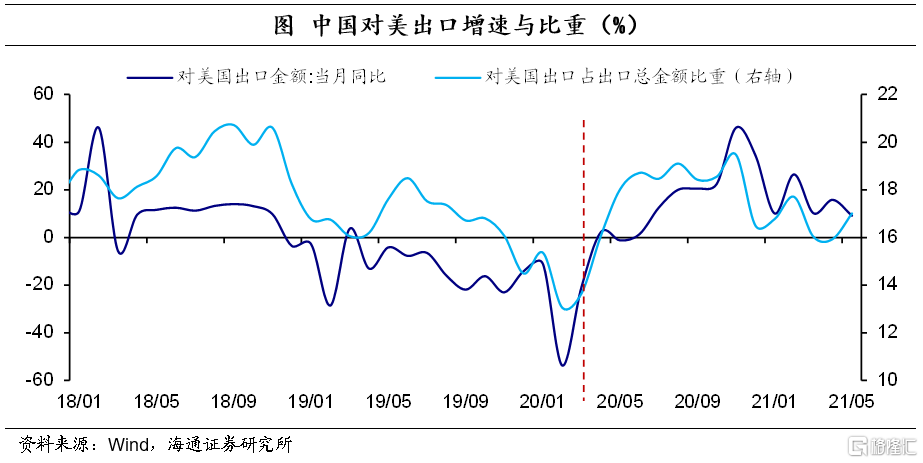往前看,在全球需求改善,海外供應仍受壓制的情況下,我國出口份額或暫穩而後降。隨着美國貨幣刺激的減弱以及海外放開與生產修復,我國出口增速或從高位回落。