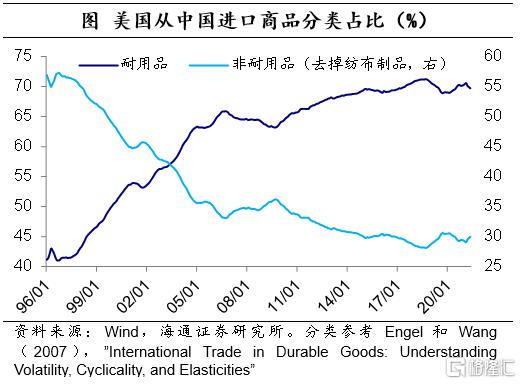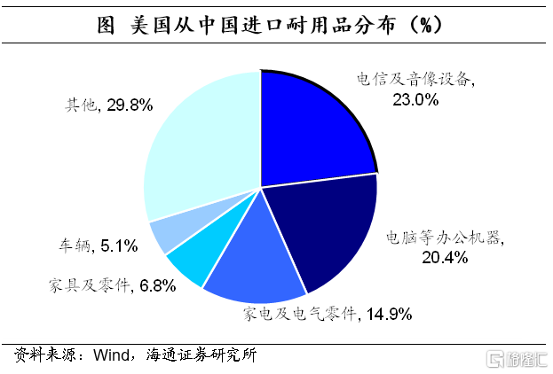 6成以上進口品爲耐用品。從結構來看,美國從中國進口非耐用品比例在不斷走低,進口耐用品比例在不斷走高,自2005年開始便超過60%。且疫情爆發後,美國自中國進口耐用品的比例再度回升,一度接近中美貿易摩擦之前的水平。具體來看,在耐用品中,音像設備、電腦、家電等出口比例相對較高,今年5月美國從中國進口這三類產品佔耐用品進口金額的23.0%、20.4%和14.9%。
