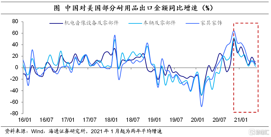 隨着美國耐用品消費的見頂,美國需求的拉動力將大幅減弱。隨着美國疫苗接種推進,疫情防控不斷放開,美國居民消費將逐步從商品消費轉向服務消費,而服務消費多爲不可貿易品,美國消費需求對中國外需的拉動將大幅減弱。例如,中國對美出口已經連續4個月放緩,尤其是主要耐用品的出口增速均大幅放緩。