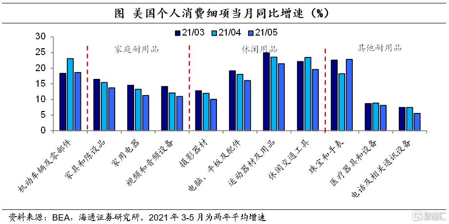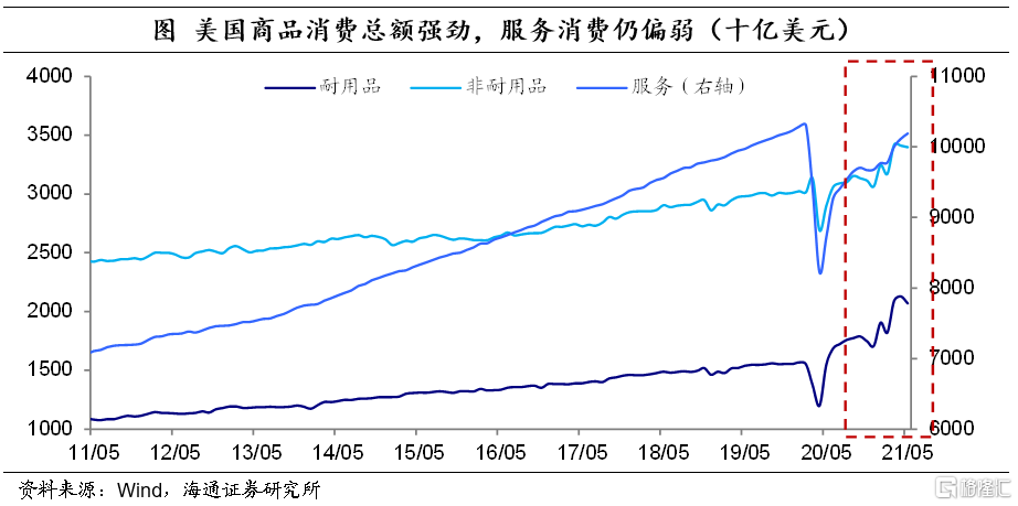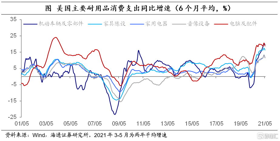 政府的高額補貼和貨幣放水的刺激,促進了美國居民收入和財富的增長,明顯提高了美國居民的消費能力。在服務類消費受限的情況下,美國旺盛的消費能力主要體現爲商品消費,尤其是耐用品消費的高增長。