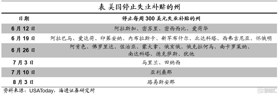 而居民收入增速已邊際放緩。截止5月,剔除基數效應後,美國居民個人可支配收入增速已經邊際放緩,從1月的8.8%回落至5月的5.5%。加之,美國第三輪財政刺激一次性補貼基本發放完畢;且爲促進就業恢復,美國已有26州宣佈停止發放每週300美元的失業補貼,未來居民收入或進一步放緩。可見,耐用品消費景氣或漸弱。