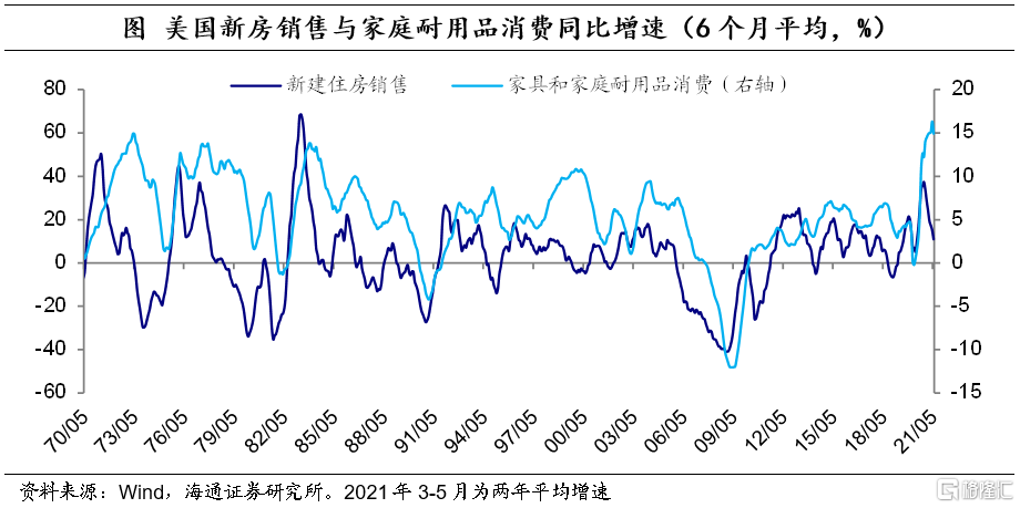 居民收入和房地產是影響耐用品消費的重要因素,尤其是疫情以來居民收入高增長以及房地產銷售火爆推動了耐用品消費大繁榮。根據歷史數據,個人可支配收入增速一般領先耐用品消費增速約4-6個月;新房銷售的同比增速一般領先家庭耐用品消費2-4個月,而這兩個重要因素已經邊際放緩;加之,美國經濟逐步放開,居家辦公等“宅經濟”產品消費也將邊際走弱,耐用品消費或已見頂。