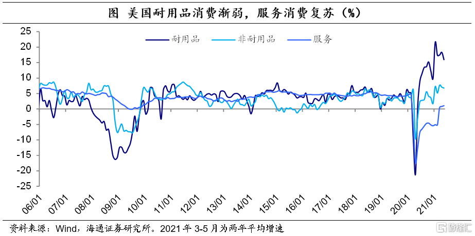 5月耐用品消費已呈走弱態勢。剔除低基數,今年5月美國耐用品消費的增速爲16.0%,較4月的18.3%略有回落;非耐用品消費的增速也由7.1%小幅回落至6.8%。不過,美國服務消費增速在持續回升,5月回升爲1.1%。