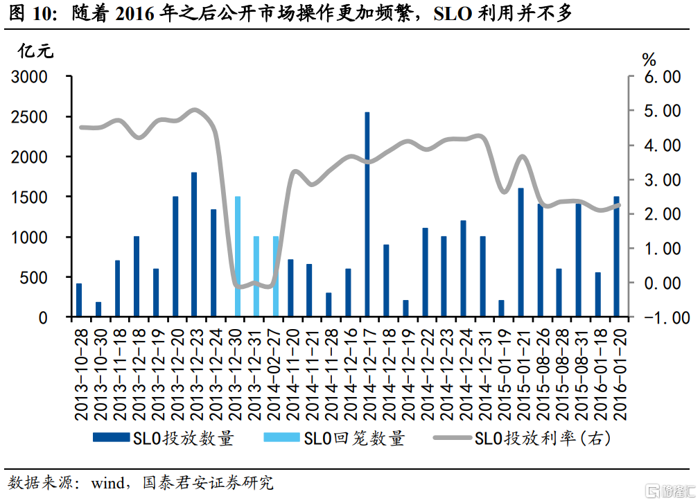 SLO至今操作29次,最近一次使用是2016年1月20日,多數是爲了彌補春節前後的流動性缺口而投放。隨着2016年之後公開市場操作更加頻繁,SLO利用並不多。