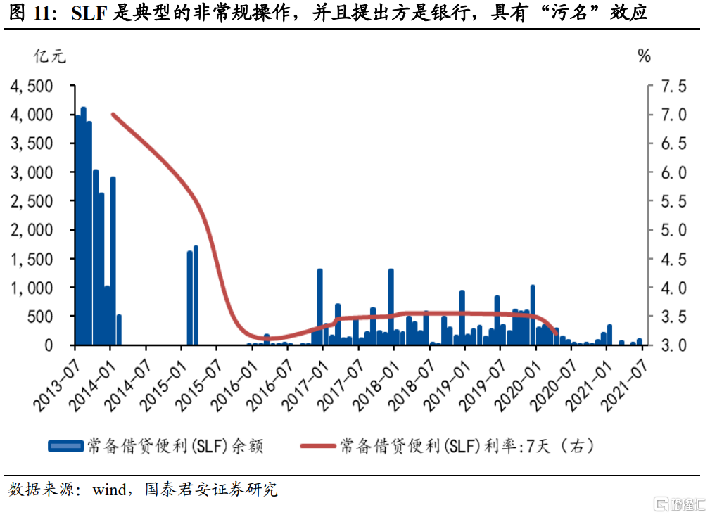 第二,常備借貸便利(SLF)也創設於2013年初,與回購、SLO一樣,都是用於補充金融機構的短期流動性需求,期限在隔夜以及7天。但與回購、SLO不同,SLF是典型的非常規操作,並且提出方不是央行,而是銀行,具有“污名”效應。