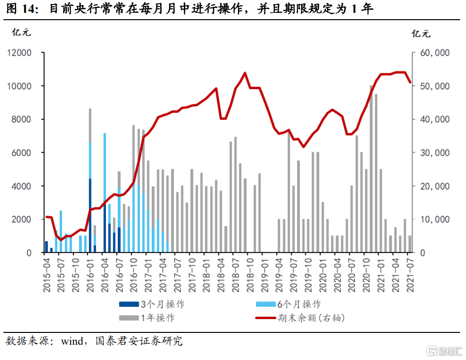 目前央行常常在每月月中進行操作,並且期限規定爲1年。當然央行也可以在他認爲有必要維護資金面緊張的時候超額或者更高頻的使用MLF,比如2020年11月因“永煤事件”爆發,央行超市場預期投放了2000億元的MLF。