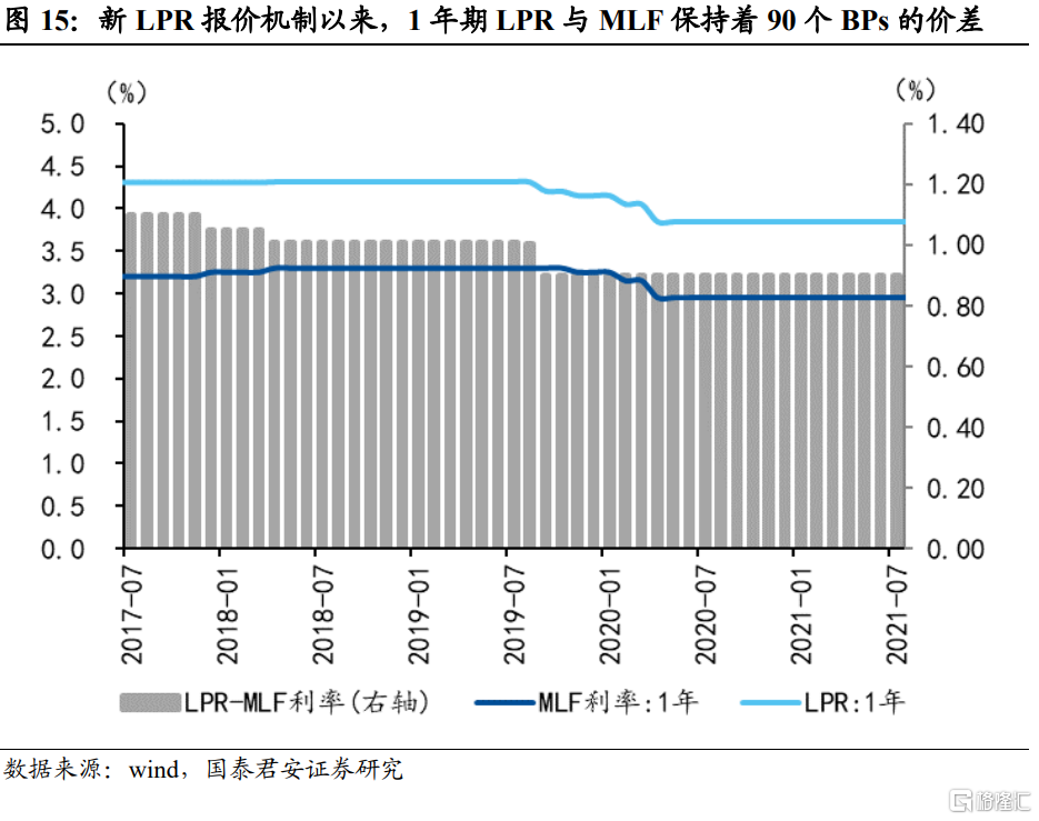 與7天逆回購利率一樣,MLF也是當前中期政策利率,作爲貸款市場報價利率(LPR)形成機制中的基準利率,具有至關重要的地位。自2019年12月後,新的LPR報價機制形成以來,1年期LPR利率與1年期MLF利率始終保持着90個BPs的價差。最後在LPR利率的基礎上,終端貸款利率再次通過“加點”形成,影響實體企業的融資成本。其中的傳導鏈條爲“MLF利率—LPR利率—企業貸款利率”。
