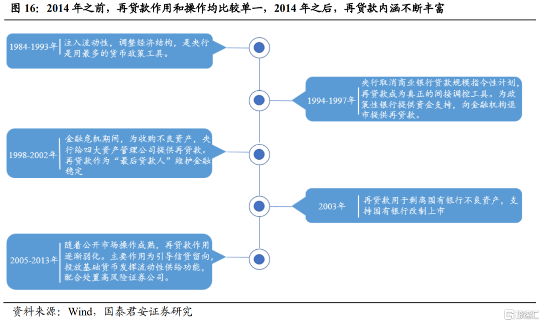 2)2014年之前,再貸款作用和操作均比較單一,2014年之後,再貸款內涵不斷豐富,分爲流動性再貸款、信貸政策支持再貸款、金融穩定再貸款以及專項政策性再貸款四大類。