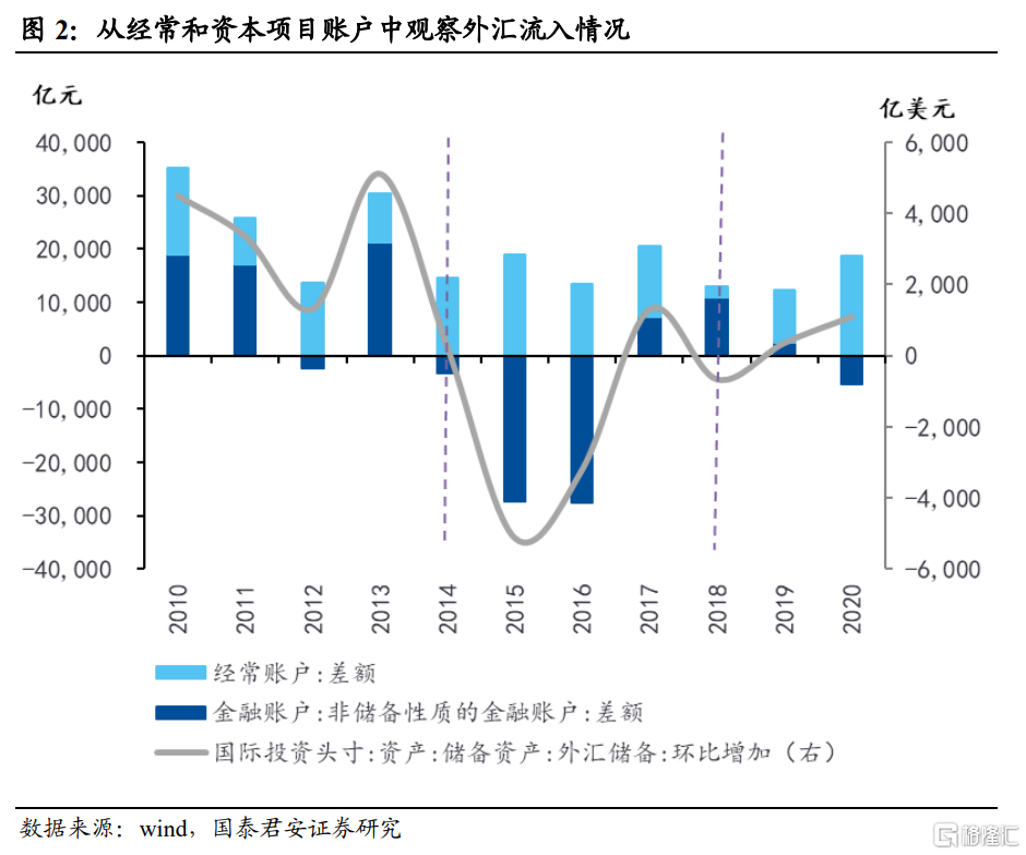 資本賬戶反映了境外對國內的直接投資以及證券投資。在資本賬戶順差較大的年份,比如2010年,2013年,政府會爲了穩定熱錢對匯率的擾動,同步地增加自己的外匯儲備。