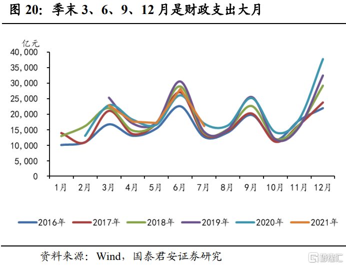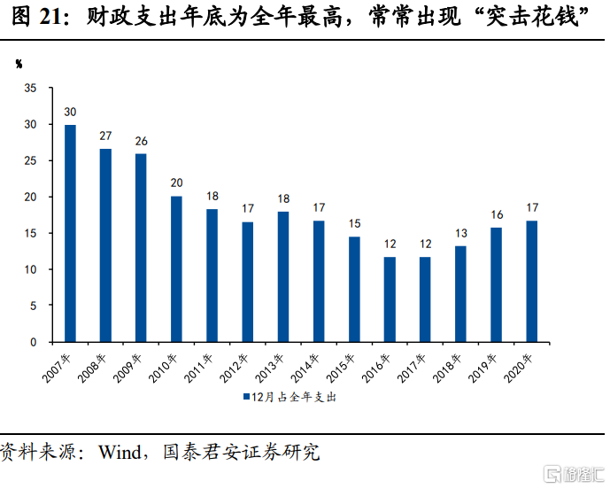 季末3、6、9、12月是財政支出大月。其中,年底佔比爲全年最高。雖然自2008年後有所回落,但近兩年年末支出佔全年支出比重仍然大約維持在16-17%附近,常常出現“突擊花錢”,因此流動性缺口就會彌合。