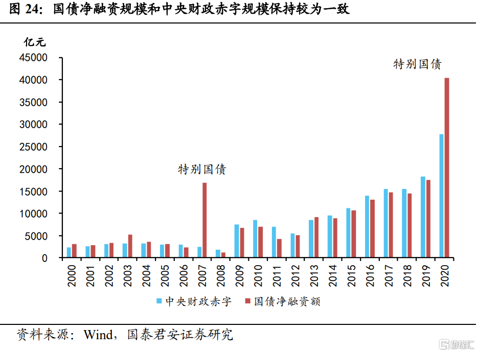 回顧自這一管理制度實施以來的近20年時間裏,除2007年和2020年發行特別國債以外,國債淨融資規模和中央財政赤字規模保持較爲一致。並且雖然沒有硬性約束,在大多數年份中(除2013年和2020年),國債淨融資額略低於赤字規模。餘額管理制度下,對中央財政債務餘額的限額是有硬性規定的,這一年度環比即爲國債發行淨融資額,但由於之前年度餘額低於規定的限額,因此,理論上是允許當年國債發行淨融資額高於赤字規模,比如2013年和2020年。