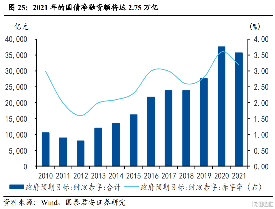 2021年的國債淨融資額將達2.75萬億。而2020年國債淨融資額在4萬億左右,退坡幅度大約在1.2萬億左右,爲利率債供給退坡的主力項。在疫情之前的正常年份,國債淨融資額在1.4萬億至1.75萬億區間內,均未超過2萬億,這或與3%爲我國前期赤字率的紅色警戒線有關。