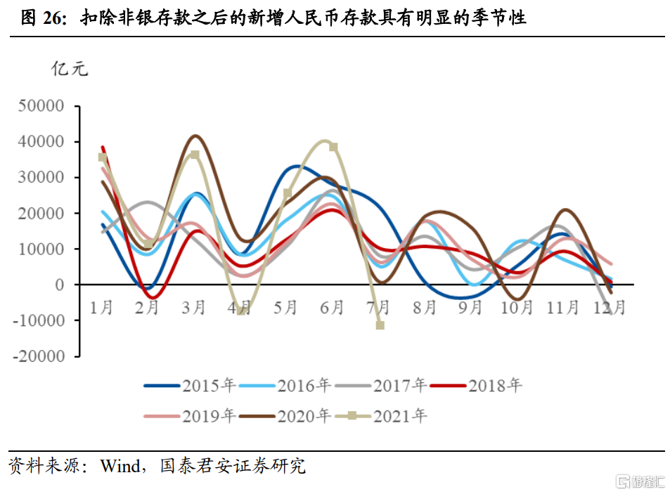 2)而從全年看,商業銀行存款規模存在明顯的季節性,一是銀行季末面臨考覈時點,傾向於加大攬儲力度,導致存款增量脈衝上升;二是受到信貸投放的季節性影響,比如1月信貸投放“開門紅”、11月信貸提前投放。