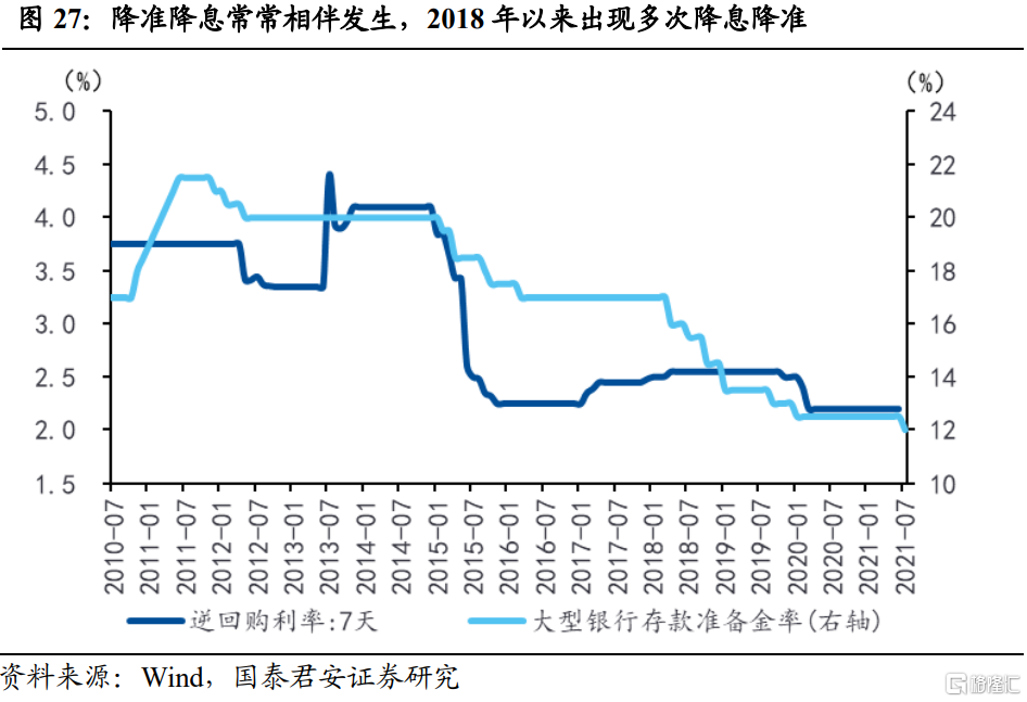 而準備金率則完全由央行決定,商業銀行沒有商討權,可以直接控制超儲率及銀行資產負債表擴張能力,因此對流動性影響較大,信號意義也較強。最新大型存款機構的法定存款準備率(在2021年7月15日降準)從2018年的17%下降到12%,中小銀行爲9%。近年使用定性降準或者降準置換MLF頻率多於全面降準,比如2020年3月16日,爲了抗擊疫情,央行就針對普惠金融進行了定向降準。截止目前,該類定向降準共進行了三次(2018年1月26日、2019年1月25日、2020年3月16日),釋放出1.1萬億的資金。2021年,央行於7月全面降準0.5個百分點,而全面降準,是自2020年1月以來的首次操作,將能釋放1萬億元的資金。