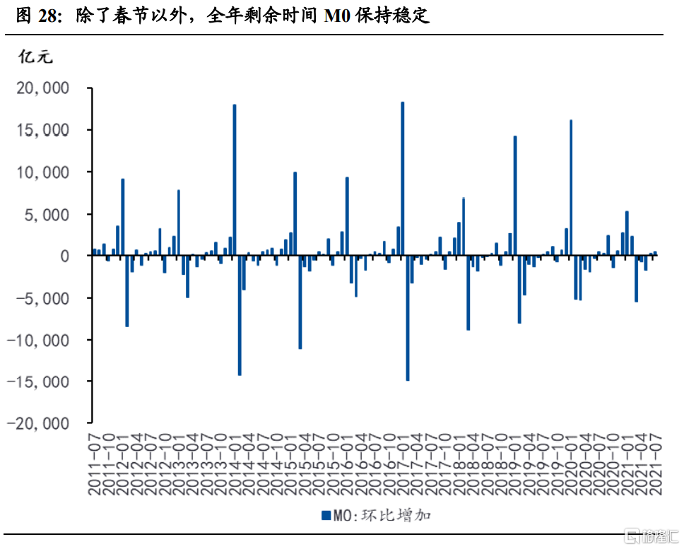 M0主導了貨幣發行的波動,並且具有明顯的節日效應。在春節,居民企業大多提取現金,流動性從銀行體系漏出,也是一個減項。央行公開市場操作中的臨時準備金動用安排(CRA)就是針對這種現金流出而設立的流動性補充。這種節日效應具有兩大特點,第一是較爲取現需求每年春節較爲穩定,趨勢向下,居民企業每年春節的取現規模都差不多,但隨着電子支付的普及,取現需求也有一定下降。第二是時效性強。隨着節日一過,便會導致流動性再度迴流。並且,除了春節以外,全年剩餘時間M0始終保持穩定。