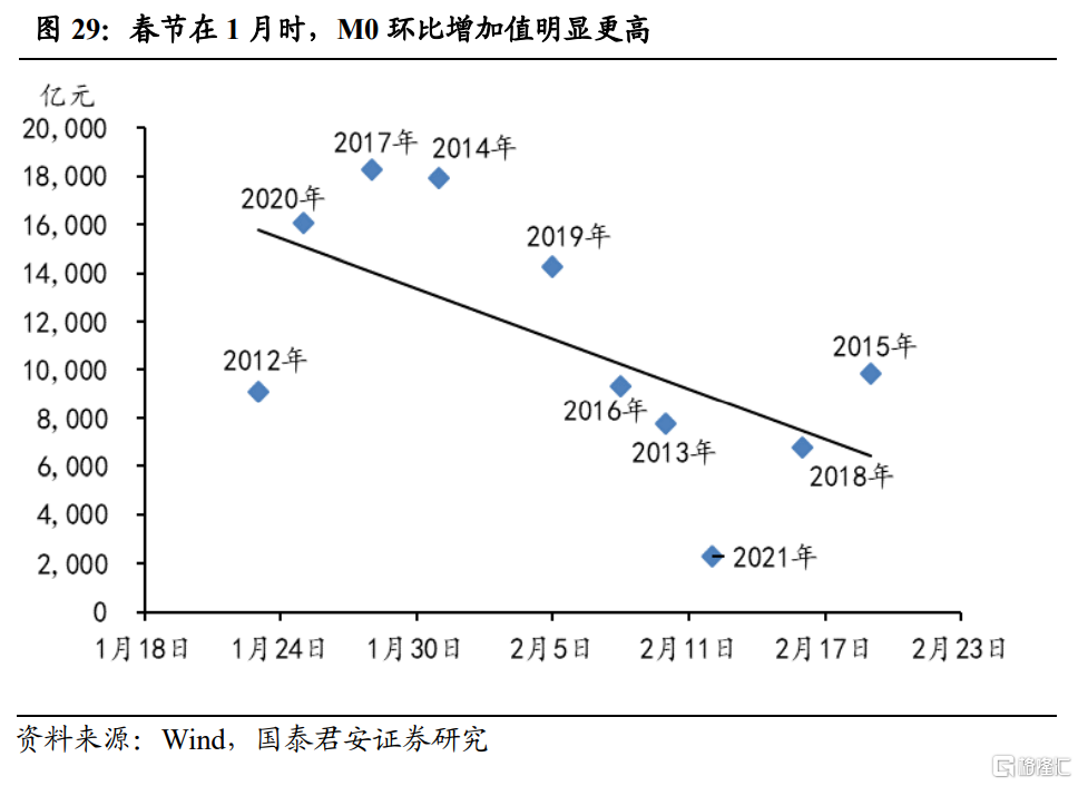 我們在估算春節期間現金缺口時,需要留心不同的春節時點對M0取現需求峯值的節奏影響。若春節在1月,則1月的流動性缺口常常因M0的需求擴大而變大,比如2014年春節在1月31日,則1月M0環比增加1.8萬億,2月環比減少1.4萬億,說明1月1.8萬億中的大部分都是春節產生的取現需求。2017亦是如此,也有約1.8萬億的M0取現需求。
