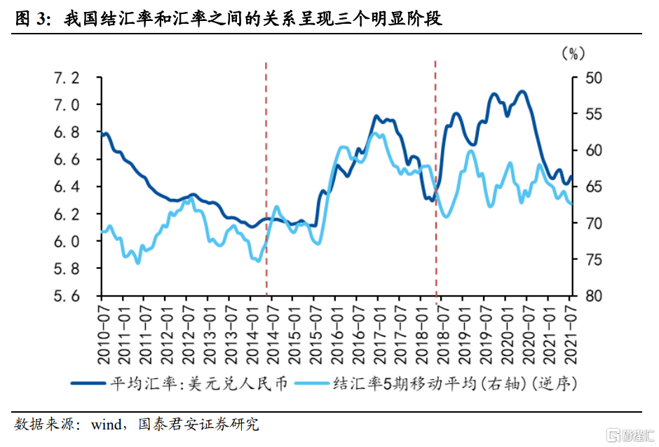 2) 在2015-2018年期間,由於2015年發生了811匯改,並且強制結售匯制度基本退場,在強烈的貶值預期下,企業居民紛紛推遲結匯,導致該年結匯率同步甚至領先於匯率走低。