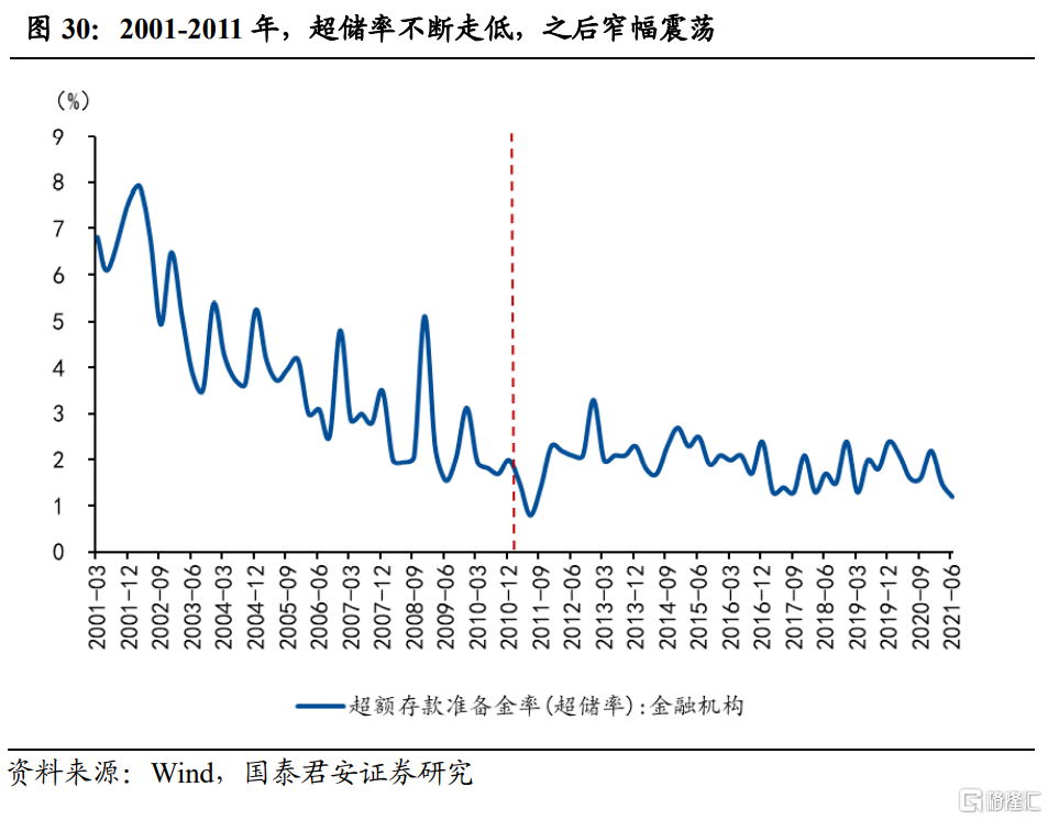 第二,2013年後,我國超儲逐步走低,在1-3%區間震盪波動,中樞顯著下移至2%附近;