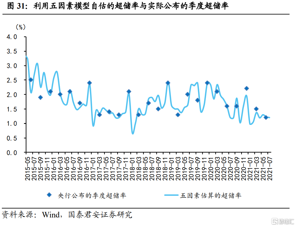 按此方法得到2021年3月末,6月末的估計值比公佈的實際超儲率均高出了0.2個百分點。從該估算序列的時間維度看,2021年的1-2月份銀行超儲的確較低,3月有了明顯的改善,6-7月份超儲水平有所擾動,出現了下降。