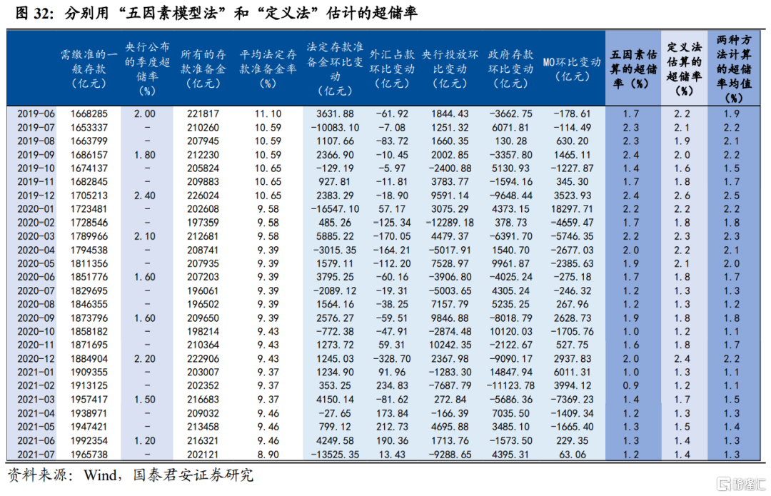 我們將兩種方法的超儲率計算進行平均發現,兩者平均值與實際公佈的超儲率在近期表現更爲一致,誤差更小。比如2020年12月兩者均值和實際公佈值均爲2.2%,2021年3月兩者均值和實際公佈值均爲1.5%,6月兩者均值和實際公佈值誤差僅在0.1%。