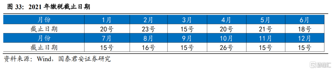全年看,由於季末之後的次月是公共財政收入大月,因此每年的1、4、5、7、10月均爲繳稅大月,其中1、4、7、10月爲季末的次月,5月爲上一年企業所得稅繳納的時點。