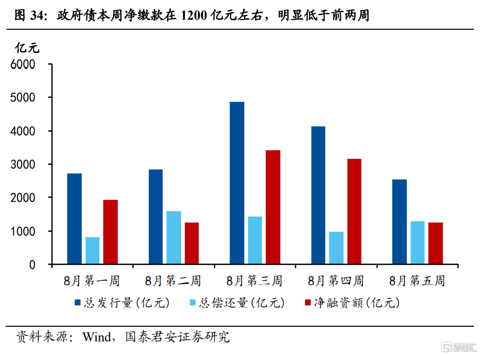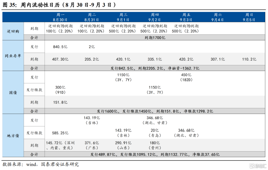 政府債本週淨繳款在1200億元左右,明顯低於前兩週的3420億元、3154億元。地方政府專項債發行在8月中下旬明顯提速,8月1日至8月27日發行合計7932億元。其中站在8月27日這一時點時,9月第一週地方政府債計劃發行規模不大,目前已知情況爲8月31日發行143.19億元地方債(吉林省)以及9月2日發行346.68億元(湖北省、甘肅省),疊加上週發行地方債在本週一繳款的數目爲585億元,合計當週地方淨繳款爲38億元,對流動性衝擊有限。國債方面,該周國債繳款共計1450億元,淨繳款在1298億元。
