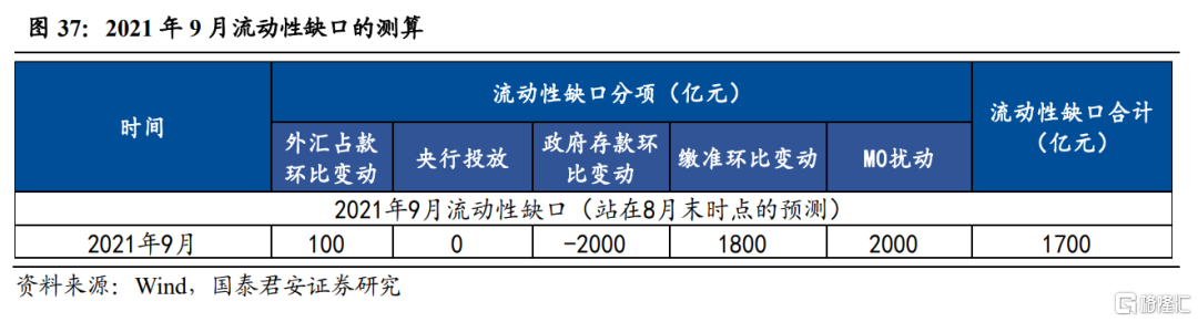 由於很多數據具有時滯,我們常常只能給出定性判斷。站在月內,五因素中,我們可以拿到的時效性最高的數據是央行的公開市場投放量。其次是每個月月內的繳稅、繳準時間點。再次是下一個周的債券發行情況。假設當前爲2021年8月27日,我們預判2021年8月30日-9月3日這一週的流動性缺口不大,各因素對流動性衝擊有限。