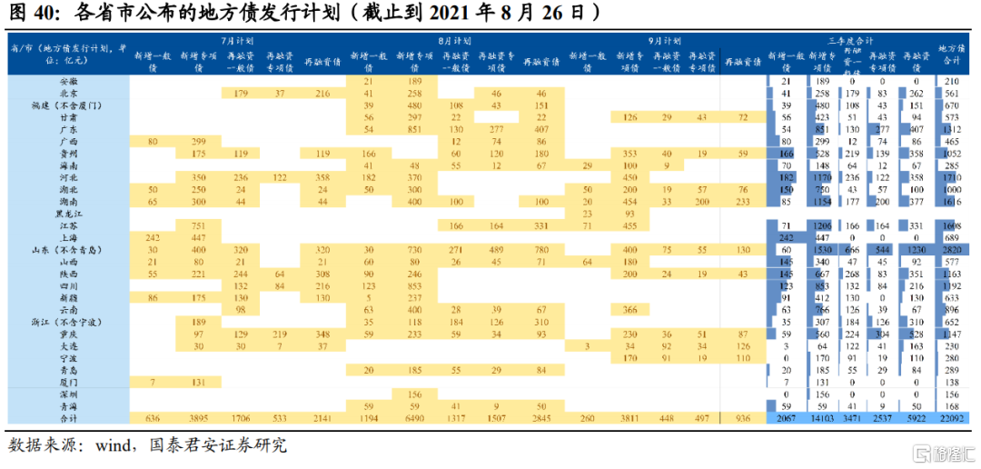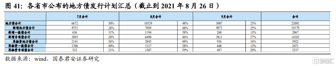地方債還剩餘1.88萬億的淨融資量將在9-12月份發行,12 月按7000 億元發行(約佔專項債新增限額的 20%),則專項債發債高峯在 9 月(7600 億元),次高爲 12 月。若專項債最終僅發行 95%,9 月發行額度爲 6000 億元,12 月由於預留出 20%的額度,將會仍爲 7000 億。