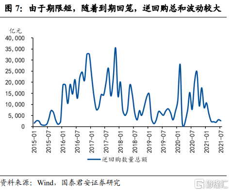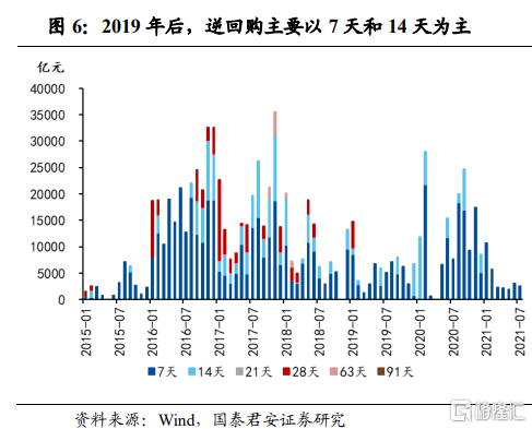 逆回購是指央行向一級交易商買有價證券,約定在未來某一特定日期賣回,逆回購投放是流動性投放,到期不續則爲流動性回籠。期限最長爲28天,最短爲7天,主要是針對短期的流動性需求。在2019年前的跨年和跨半年時點,央行常常會提供28天的較長期限的逆回購,而2019年之後,央行逐漸只採用7天和14天的逆回購,並且又以7天爲主,體現了公開市場操作的精細化。