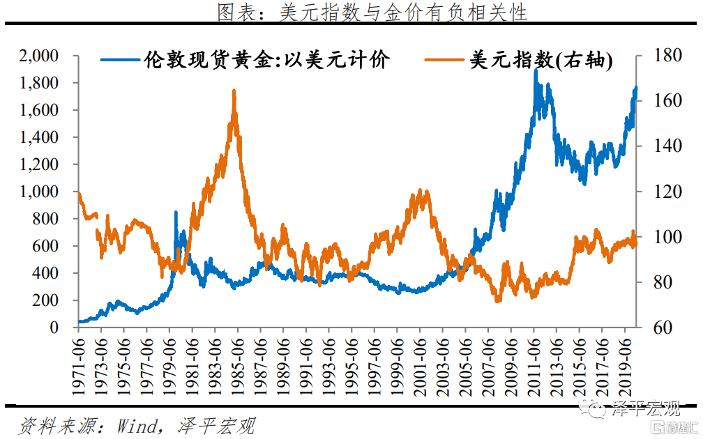 美元指數對於黃金的影響分爲兩個層面:一是國際市場上黃金由美元標價,所以美元指數直接影響黃金價格,當美元下跌,黃金本身價值沒有發生變化,則體現爲金價上漲,兩者關係偏向於同一現象的反向指標;二是黃金與美元同時具有貨幣屬性,有相互替代效應,當美元價值下降,黃金作爲貨幣的地位上升,價格上漲,兩者偏向因果關係。從歷史數據來看,黃金與美元指數具有一定的負相關性,相關係數爲-0.43。