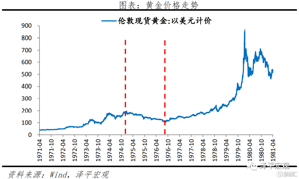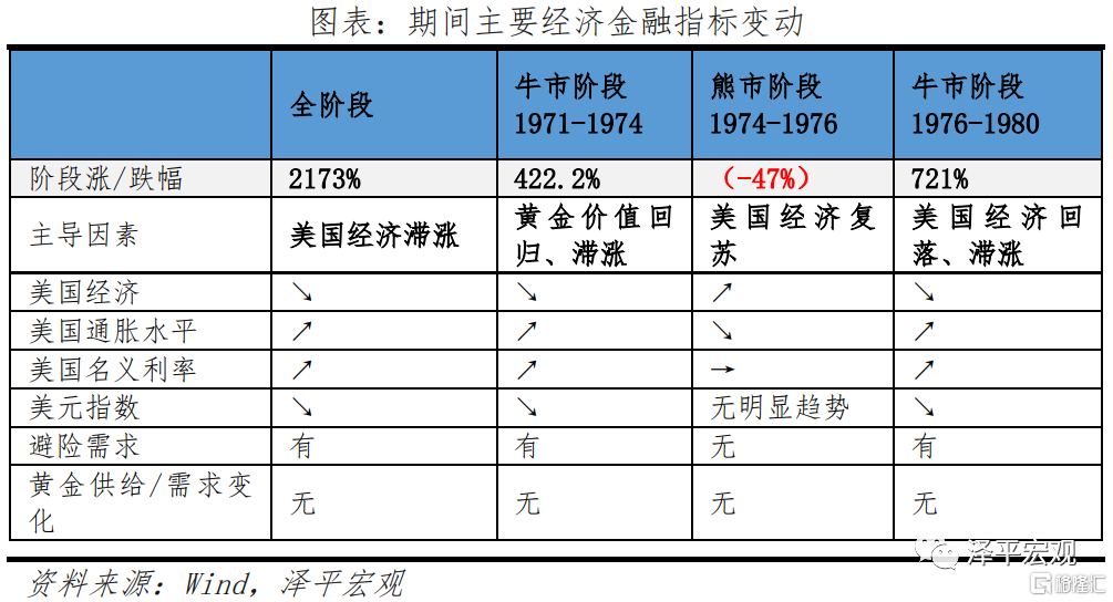 這一階段黃金牛市基本遵循美國經濟基本面和實際利率情況。第一,美國經濟滯漲是主導這一階段黃金價格上漲的主要因素,背後的原因包括通脹上行,美國經濟增速顯著下滑,美聯儲降低利率,實際利率大幅下降,資金外流,美元指數下降。第二,70年代出現兩次石油危機,避險需求同樣顯著。但是,兩次石油危機間,由於美國經濟短暫復甦,黃金價格曾出現短期回調波動。