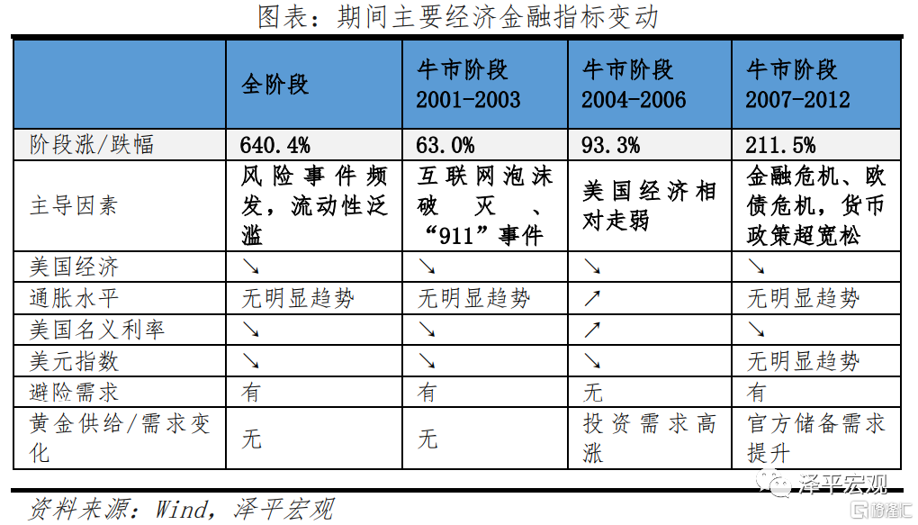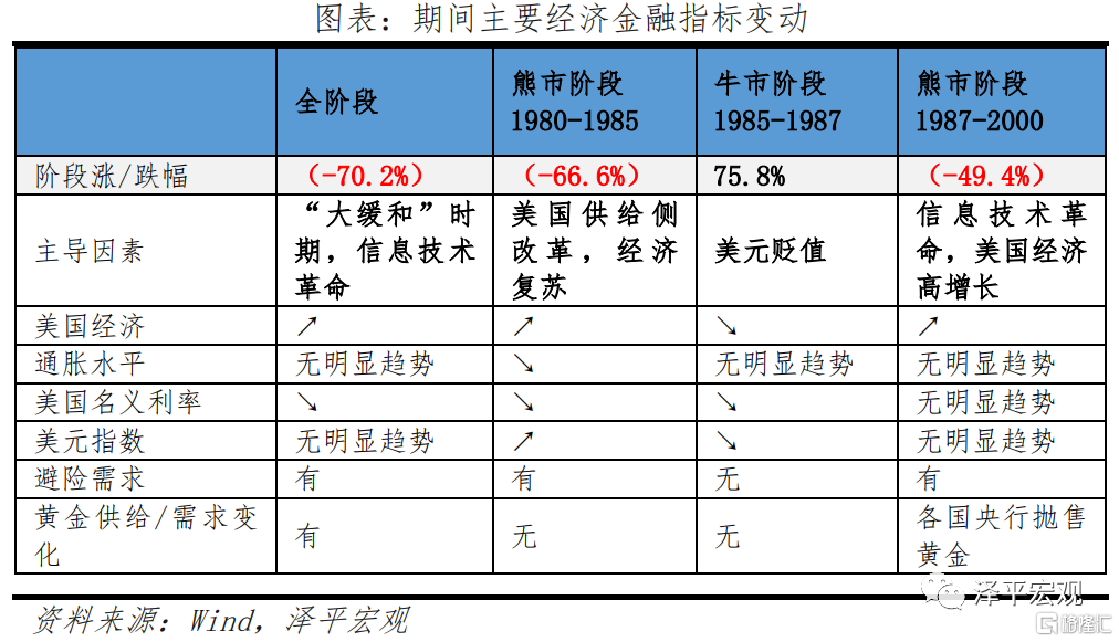 這一階段黃金熊市主要遵循美國經濟基本面情況。美國供給側改革後,經濟增長動力增強,疊加信息技術革命,經濟潛在增長率提升,疊加通脹水平較低,實際利率上升,黃金價格整體呈下行趨勢。