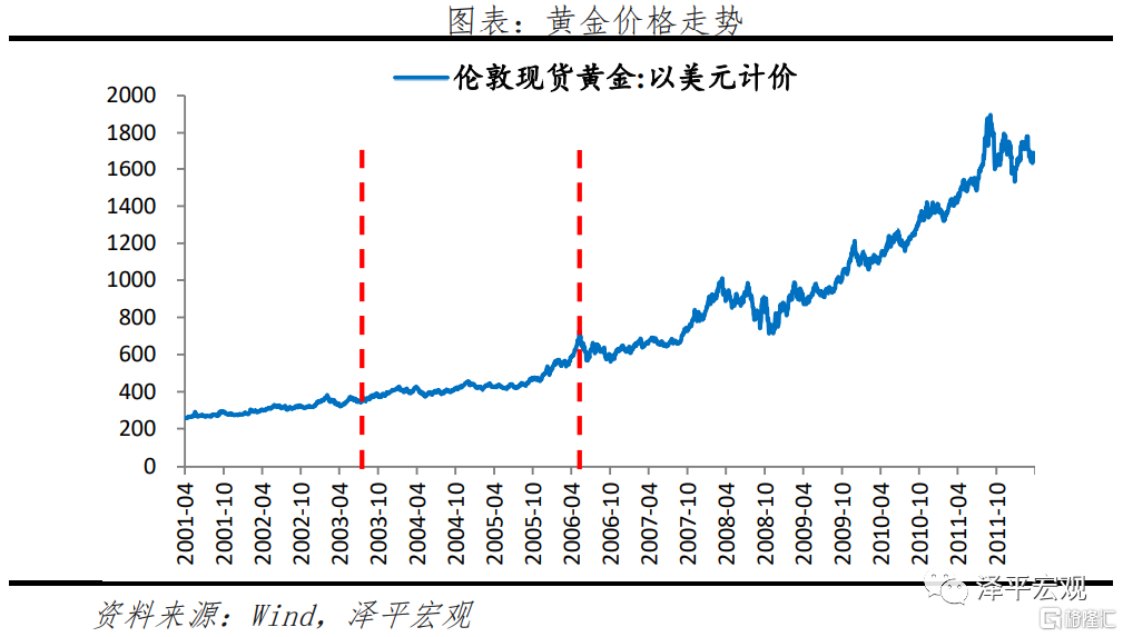 第二輪黃金大牛市從2001年開啓,黃金價格由256.0美元/盎司漲至2011年最高點1895美元/盎司,階段總漲幅高達640.4%。這一階段是歷史上最長的流動性氾濫時期,各國央行加大貨幣寬鬆力度以對衝頻發的經濟金融危機、恐怖主義事件、地緣政治危機帶來的負面影響。長期寬鬆下,通脹預期擡升、實際利率下行、美元指數走弱,黃金呈現大牛市。