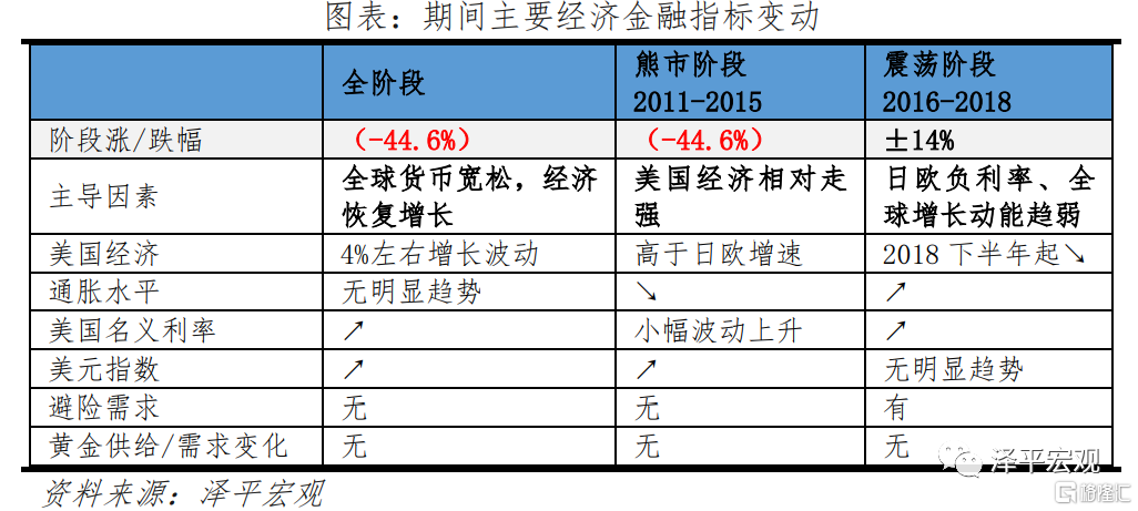 第二輪黃金熊市從2011年9月開啓,黃金價格由1895.0美元/盎司跌至2015年的1049.4美元/盎司,此後至2018年金價維持箱體震盪格局,價格維持1000美元/盎司-1400美元/盎司,階段總跌幅爲44.6%。這一階段隨着美國經濟回暖、美聯儲政策轉向,整體低通脹、實際利率回升,此外日歐經濟仍低迷反襯美國增長相對強勢,金價快速下跌,進入熊市區間。