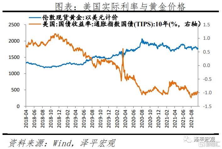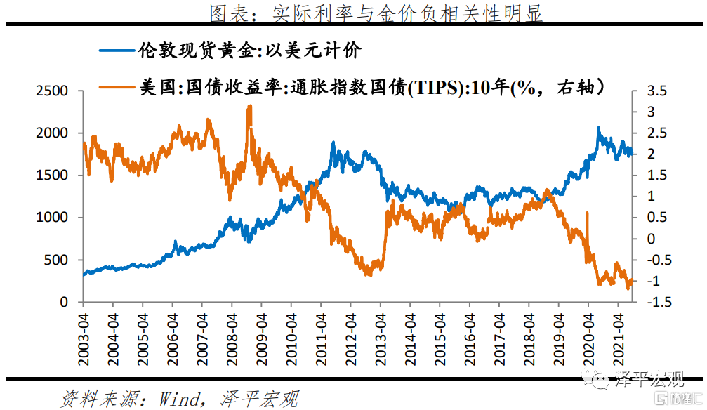 黃金作爲大類資產之一,具有金融投資品的屬性。在黃金的金融屬性下,其價格受兩大因素影響,一是由於黃金“零票息”,其價格與實際利率水平負相關,二是作爲保值投資品,與通脹水平正相關。