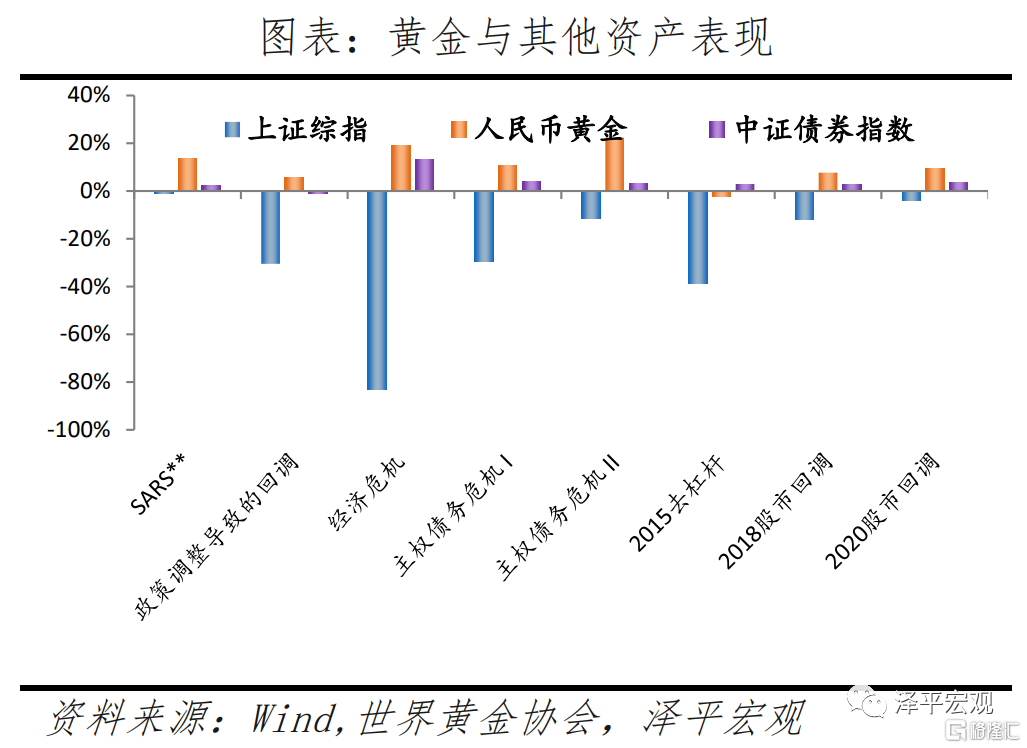 而在金融資產不斷擴張的同時,其對系統性風險的對衝需求也會越發旺盛。黃金作爲獨立於國內資產的貴金屬,有其天然的系統性風險對衝性。黃金作爲相對易配置,同時受到美元指數、國際風險係數、美國實際利率、世界通脹水平、全球黃金供給水平以及全球需求水平等因素綜合影響。相對國內經濟單一波動影響來說,配置黃金能夠在中國股市發生系統性風險時起到對衝作用。根據世界黃金協會的數據,當上證綜指下跌幅度超過一個標準差時,黃金與其呈現負相關性;當上證綜指上漲超過一個標準差時,黃金與其呈現正相關;同時,在中國市場拋售時期,黃金的平均收益率爲10%,起到了對衝國內權益風險的作用。