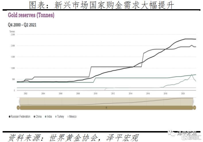 受美國長期貨幣超發影響,美元信用貨幣地位受到衝擊,從2009年起,全球央行從黃金淨賣出轉爲黃金淨買入,未來黃金淨購買量可能仍保持強勁的增長態勢。當前各國央行持有美元外匯儲備的收益降低、風險提高,各國開始戰略性增持黃金。與發達國家相比,以中國、印度、墨西哥、俄羅斯以及土耳其爲代表的新興市場國家黃金儲備佔比仍顯著偏低,新興市場國家已經把提高黃金儲備佔比作爲國際儲備多元化的一大方向。根據世界黃金協會統計數據,2021年上半年全球央行共購進333噸黃金,比五年來的上半年平均水平高出39%,未來新興市場央行持續的購金行爲或將成爲長期的金價支撐。
