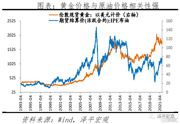 然而黃金與通脹的關係存在兩個特徵:一是在通脹穩定階段,通脹與金價相關性較弱,但在通脹大幅波動階段,金價往往有明顯漲幅;二是總體來看,黃金價格的高點比CPI高點領先了2-4個月,也就是說,真正影響黃金價格的應該是通脹預期。我們用原油期貨價格衡量通貨膨脹的預期,檢測通脹預期是否會推高黃金價格,發現在大部分時間內,原油期貨價格幾乎與黃金現貨價格的趨勢相同,相關性達0.79。