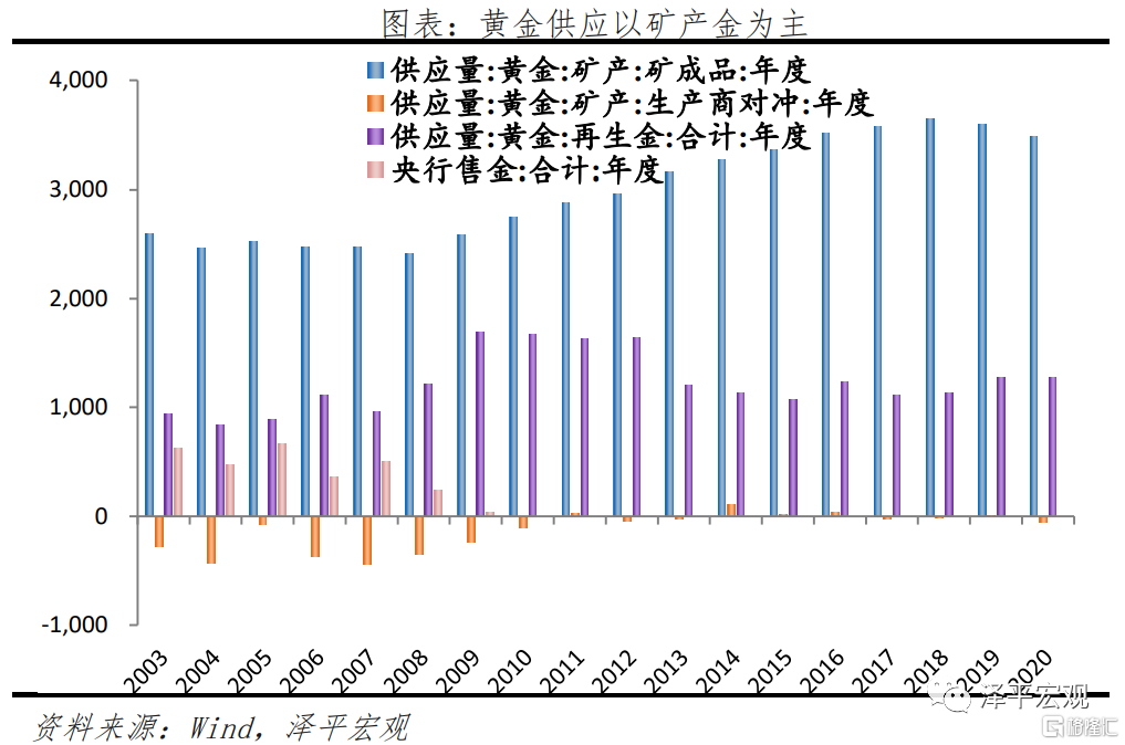 黃金的供給主要包括礦產金、生產商對衝、再生金和官方售金。自有人類文明以來,世界共開採黃金19.7萬噸,尚有大約4.7萬噸黃金可待開採,意味着全球黃金儲量中大約 76%已被開採。2003年至今,黃金年供給量變化不大,約爲4000噸左右,佔存量比重僅2%。具體來看: