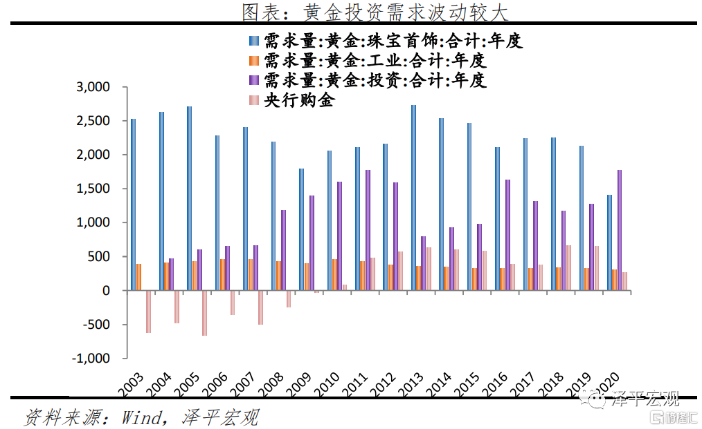 整體而言,金飾需求和工業需求整體波動不大,兩者合計佔比約爲50-60%,決定了黃金的總需求水平和黃金價格的中樞水平。短期來看,投資需求波動較大,決定黃金短期價格,長期來看,官方儲備需求是長期黃金需求上漲的主要推動力,決定黃金長期價格走勢。