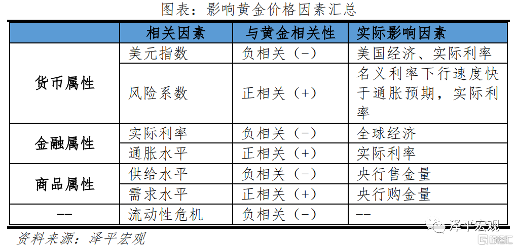 分析框架:黃金同時具有貨幣屬性、金融屬性和商品屬性,三種屬性共同決定金價走勢。貨幣屬性:黃金由於其稀缺性,曾經長時間作爲貨幣存在。在黃金的貨幣屬性下,一方面與計價貨幣美元存在替代性,金價與美元指數負相關,另一方面相較於信用貨幣,黃金作爲實物貨幣避險效果更佳,金價與風險指數正相關。金融屬性:在黃金的金融屬性下,其價格受兩大因素影響,一是由於黃金“零票息”,實際利率是持有黃金的機會成本,金價與實際利率水平負相關,二是黃金投資具有保值性,金價與通脹水平正相關。商品屬性:作爲商品的黃金,可以被用於日常消費和工業生產,或者用於儲藏和交易。在黃金的商品屬性下,一方面受黃金供給影響,金價與供給量負相關,另一方面受黃金需求影響,金價與需求水平正相關。