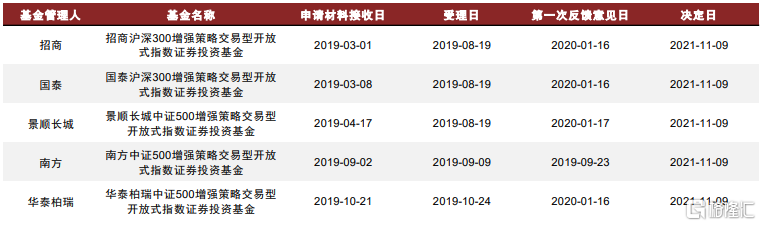 本次獲批的產品共有5只,分別為招商滬深300增強策略ETF、國泰滬深300增強ETF、華泰柏瑞中證500指數增強策略ETF、南方中證500增強策略ETF和景順長城中證500指數增強ETF。這些產品均以主流寬基指數滬深300指數和中證500指數為基準,這兩個指數是現在增強指數基金中主要的跟蹤指數,均已經有較為成熟的增強策略。其中,招商、國泰、華泰柏瑞和南方基金旗下的指數增強ETF將在上交所上市,而景順長城旗下的增強ETF將在深交所上市。
